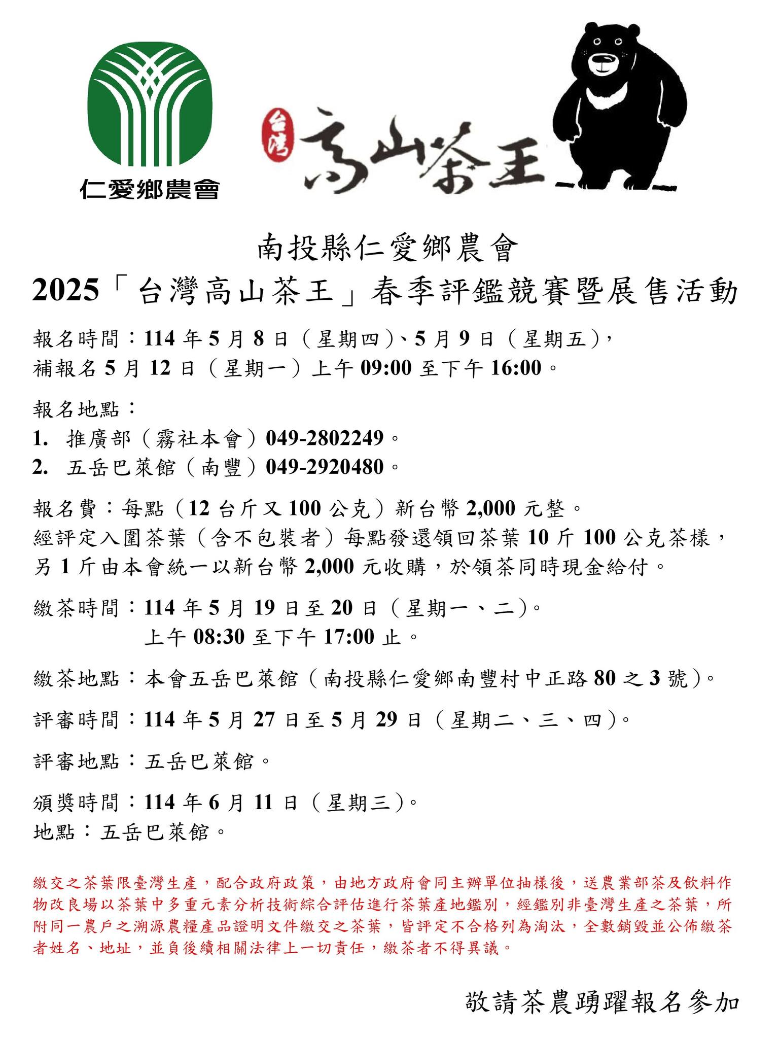 2025「台灣高山茶王」春季評鑑競賽暨展售活動即將開始報名囉,請茶農朋友踴躍報名參賽。