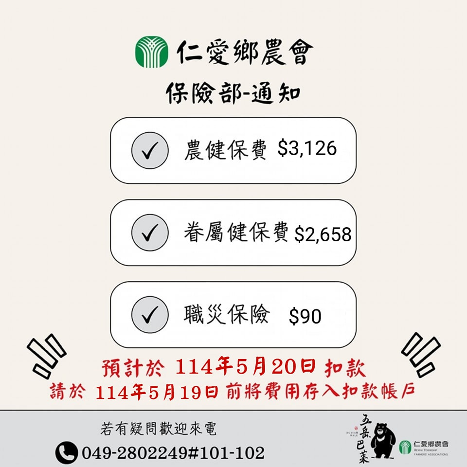 仁愛鄉農會保險部-通知-114年5月20日農健保費扣帳