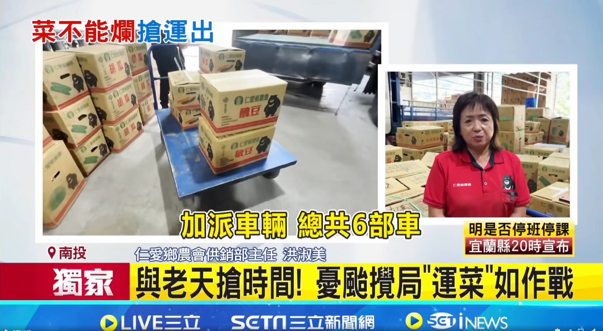 ※楊柳颱風明天登陸,全鄉農民搶收農產品,就像作戰一樣!農會今天特別加派六台貨車前往各部落載運蔬菜,畢竟颱風會造成什麼影響真的很難講。