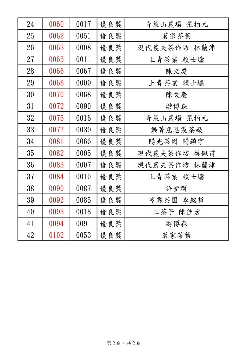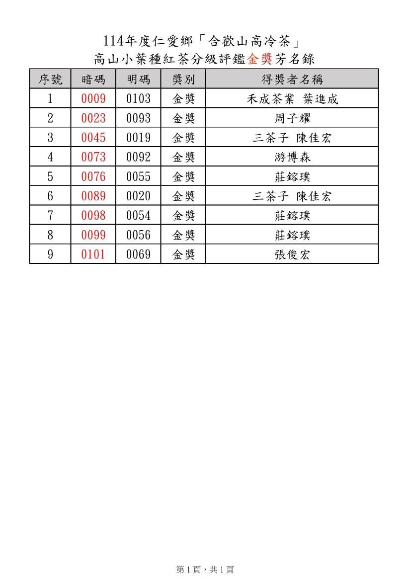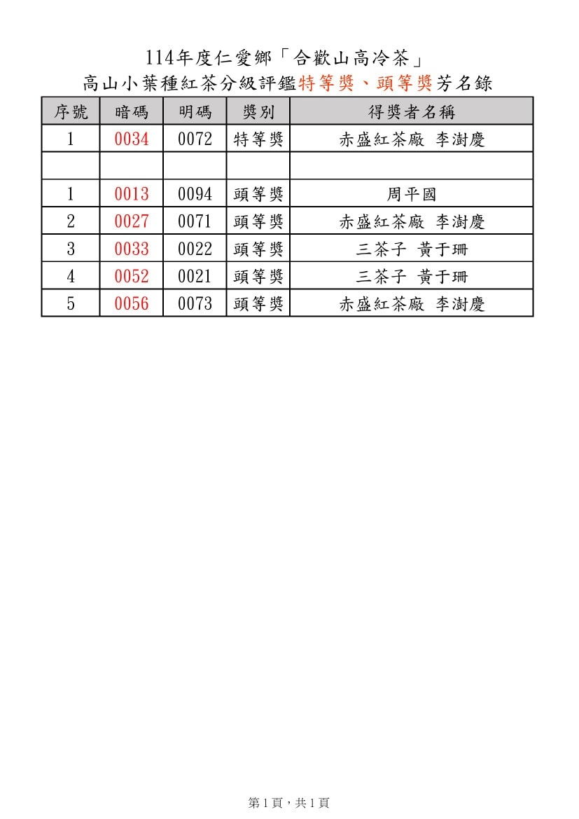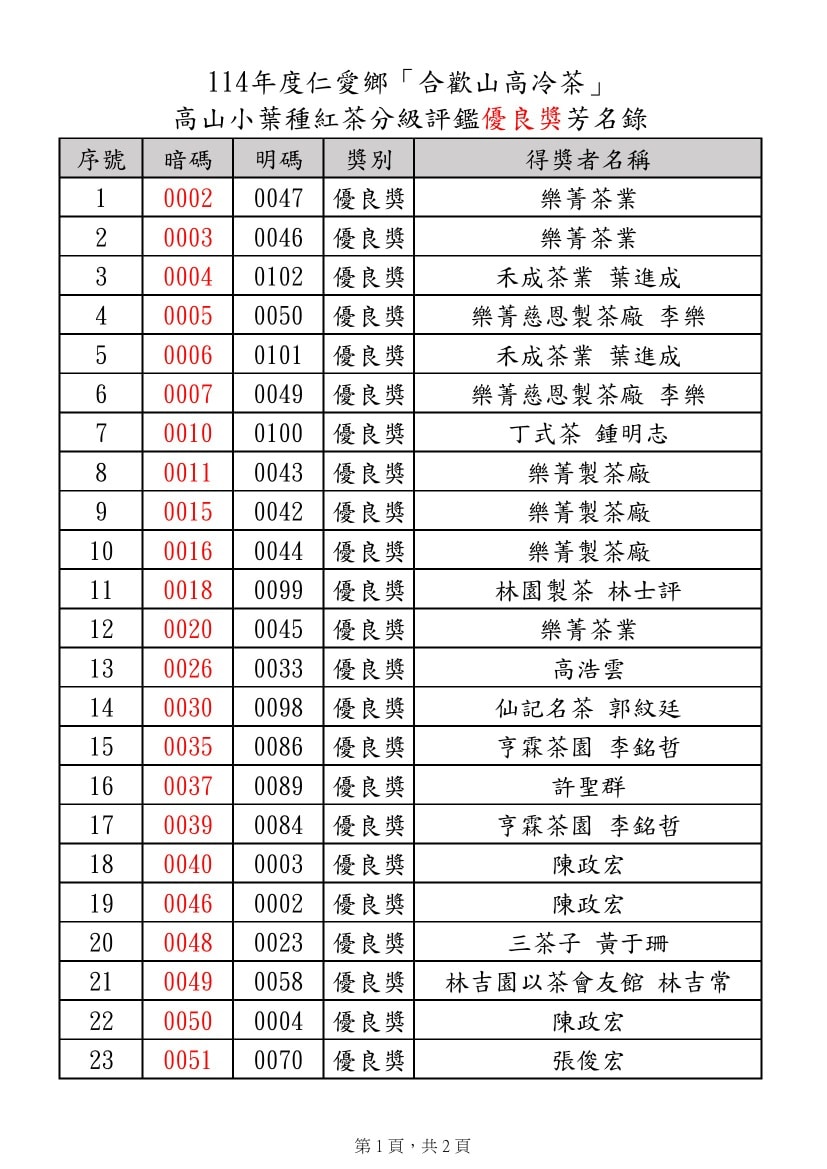 本次114年度仁愛鄉「合歡山高冷茶」高山小葉種紅茶分級評鑑參賽件數計103件,淘汰率44.7%,其他獲獎者包括: