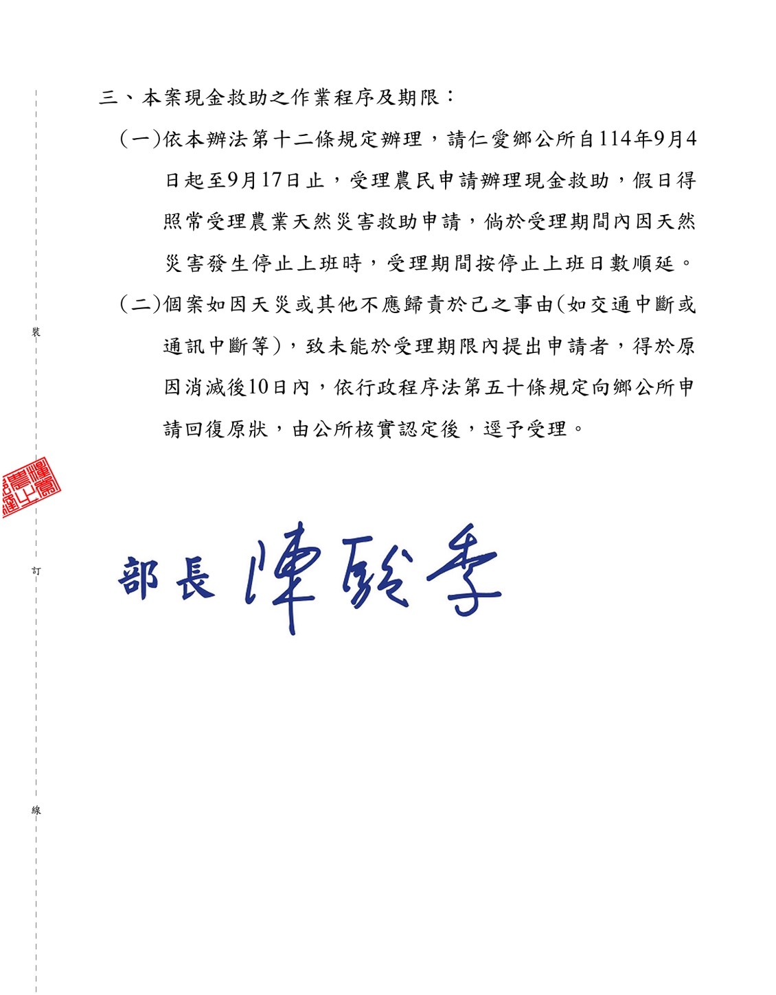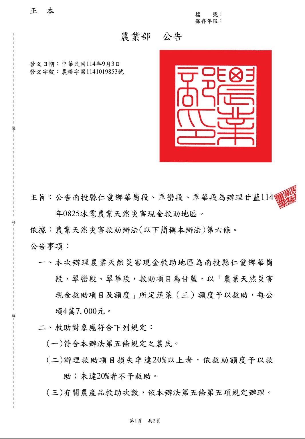 重要公告:公告農業天然災害現金救助,即日起至114年9月17日止
