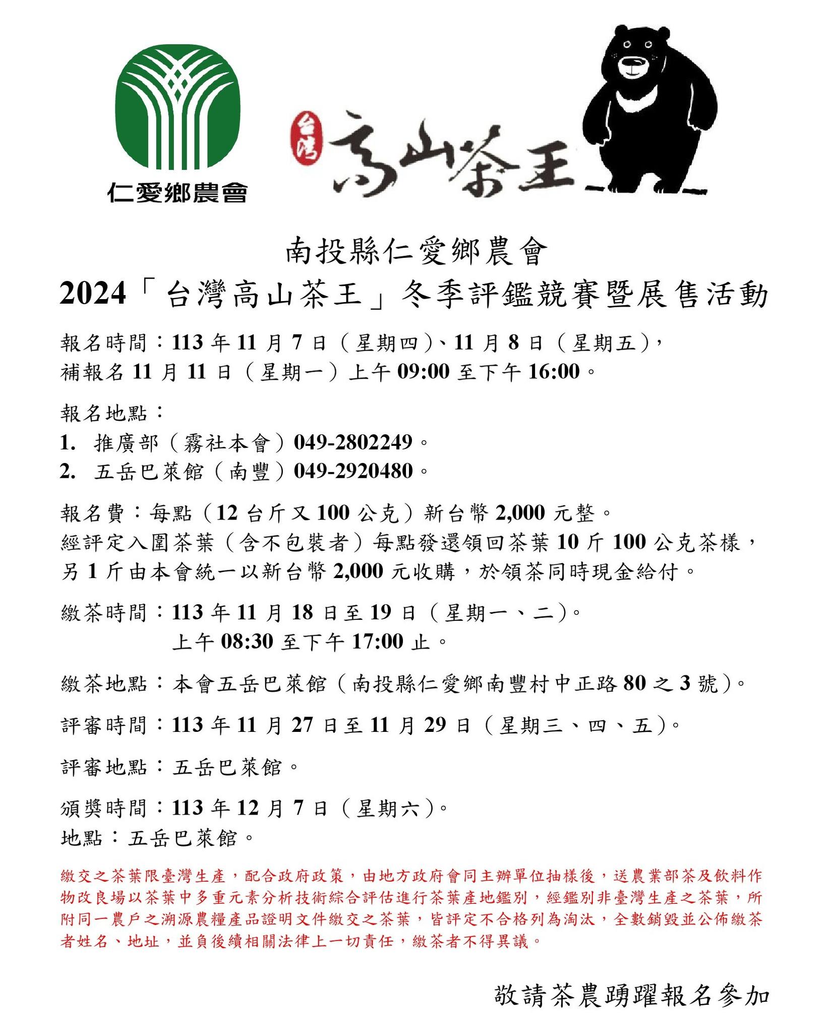 2024「台灣高山茶王」冬季評鑑競賽暨展售活動即將開始報名囉,請茶農朋友踴躍報名參賽。