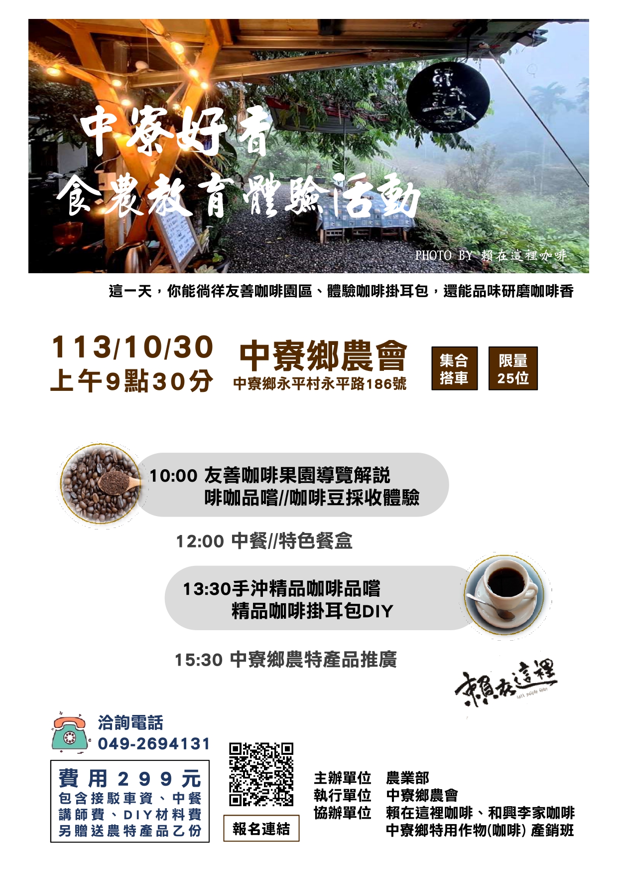 中寮鄉農會辦理「中寮好香:食農教育體驗活動-咖啡場次」活動,歡迎報名參加