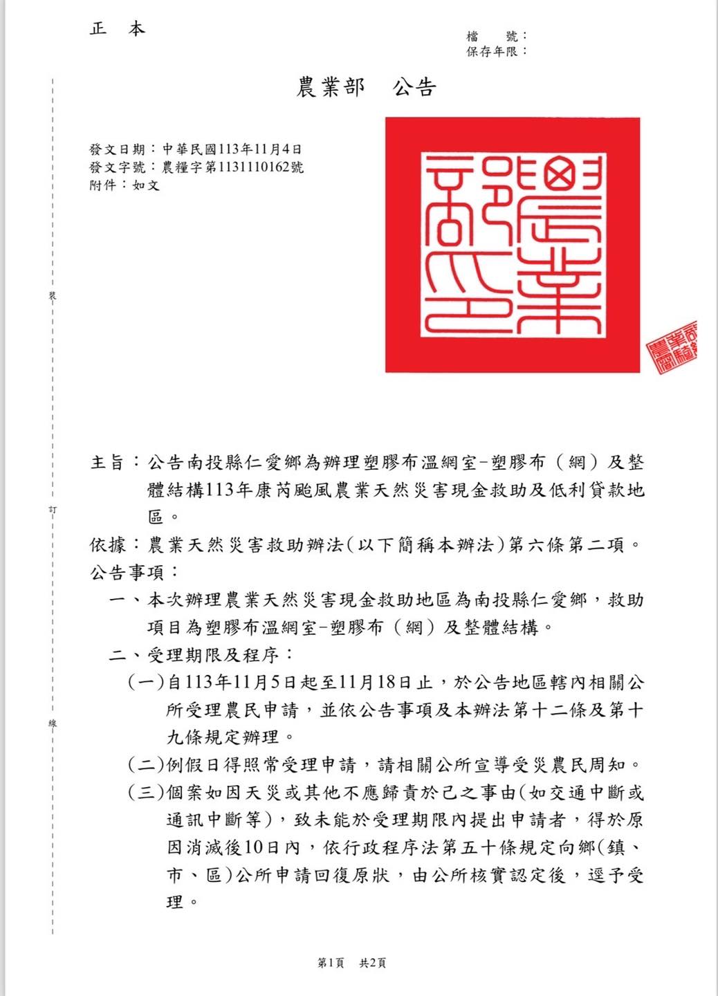 公告仁愛鄉辦理塑膠布溫網室-塑膠布(網)及整體結構113年康芮颱風農業天然災害現金救助及利率貸款地區。