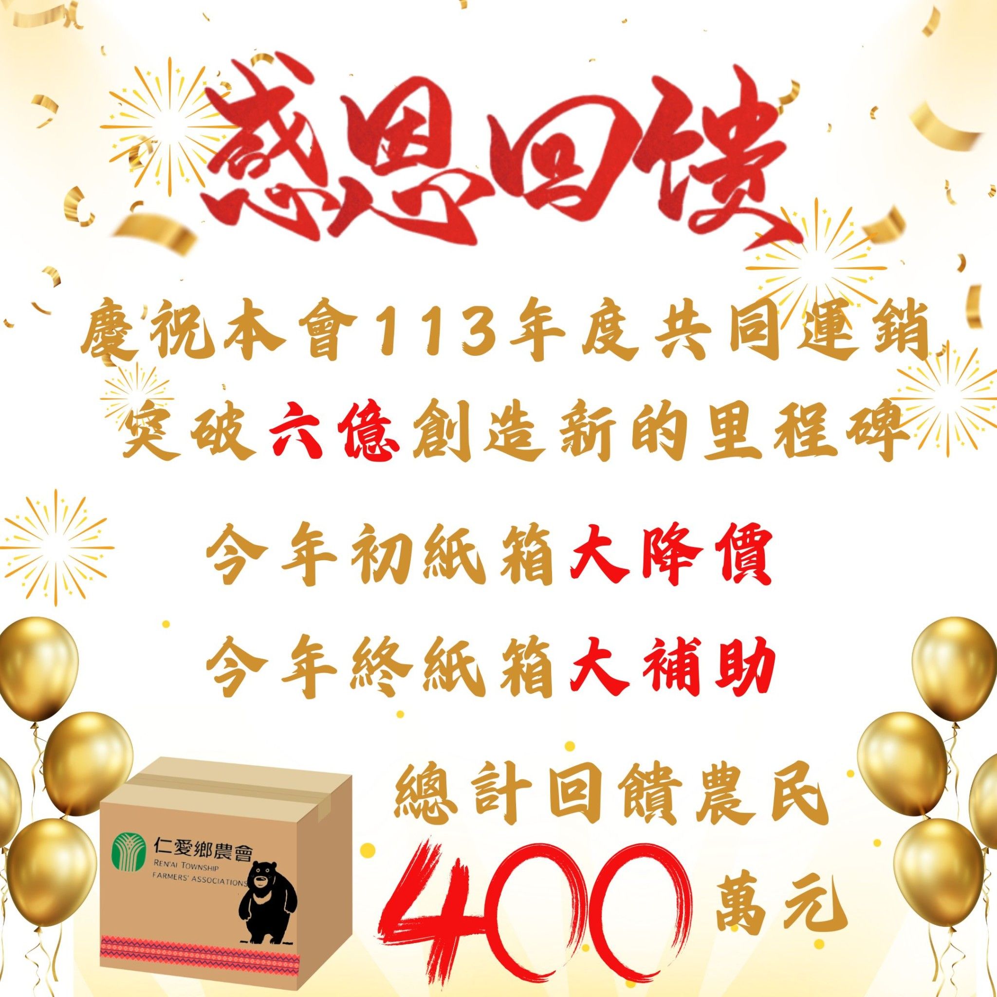 § 慶祝113年度共同運銷金額突破6億元,開創歷史新高!為感謝農民朋友們的辛勤耕耘與肯定,年初紙箱大降價,年終特別再加碼紙箱補助,總計回饋四百萬餘元。
