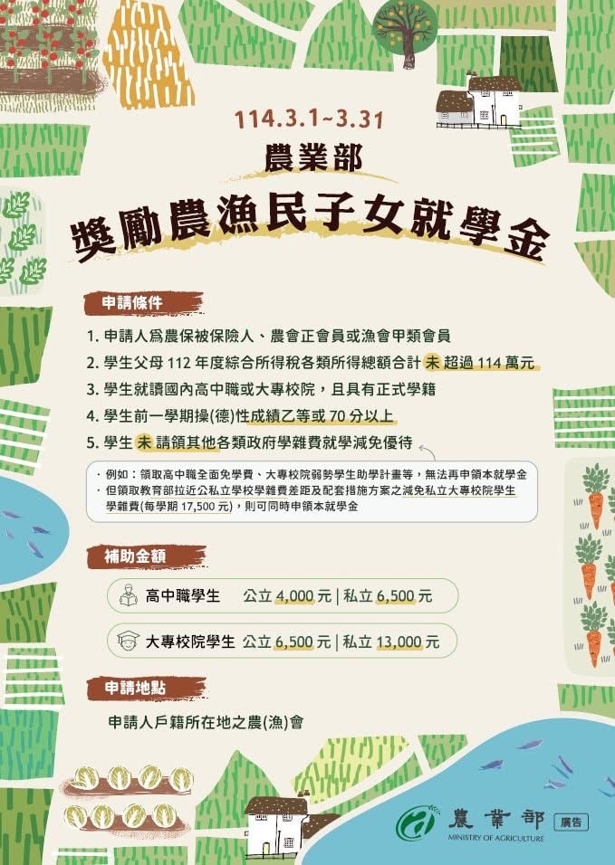 獎勵農漁民子女就學-即將開始申請囉(3/01-3/31)